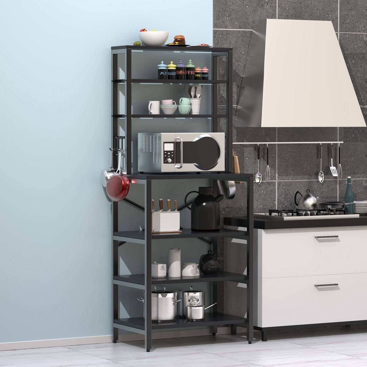 This Modern Black Metal Wood Kitchen Baker's Rack Shelf Microwave Stand provides enough space for storing a variety of everyday essentials, keeping your vegetables, fruit, microwave, cooking and eating utensils, plates and other kitchen accessories in plain sight and easy to access. 5 free S-shaped hooks are perfect for hanging kitchen towels and cooking spoons.It is your best choice for storage and saving space. This baker's rack is made of particleboard and iron bracket. The iron bracket is sturdy and durable, and the wooden board is waterproof and anti-friction. Also, its dimensions are 23.6 inches (length) x 15.7 inches (width) x 70.2 inches (height). Give your kitchen a refresh that’s as charming as it is practical; black give this kitchen shelf a unique look that you’ll want to show off during your next dinner party. This free standing backer rack not only can be used as a kitchen backer rack, but also can be used as an entryway storage shelf, spice rack and storage rack. We've got you covered anytime you have any issue regarding our product quality or any problem during use.