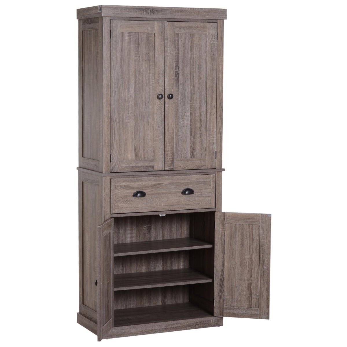 This elegant FarmHome 6ft Kitchen / Bathroom Storage Pantry Drawer Cabinet Wood Grain becomes a functional centerpiece in any room, adding charm along with ample storage and display space. The kitchen pantry features a single center drawer with both the upper and lower doors opening to 1 fixed and 2 fully adjustable shelves, which allows for flexible storage space that fits your individual needs. The kitchen pantry features a single center drawer with both the upper and lower doors opening to 1 fixed and 2 fully adjustable shelves, which allows for flexible storage space that fits your individual needs. Constructed from engineered wood with a reinforced backboard and wall attachments for added stability and safety. he vertical kitchen cabinet takes up little floor space that measures 30 inches W x 16 inches D x 72.5 inches H, with an overall 220lbs weight capacity.